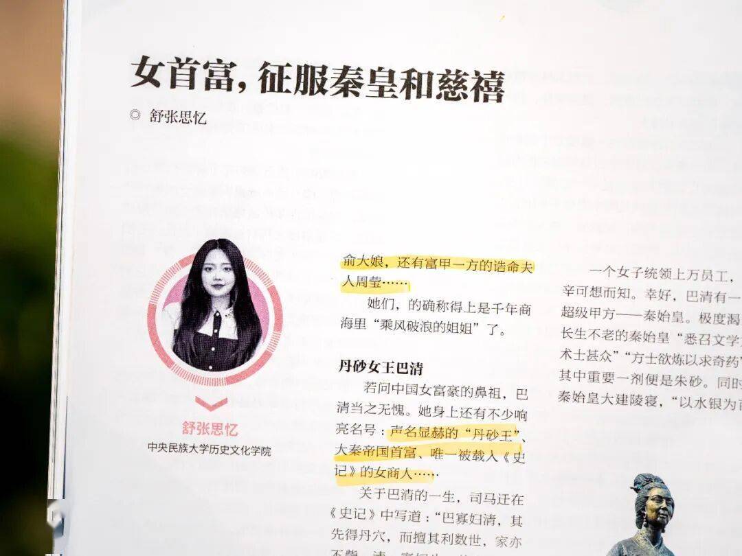 。也是唯一被载入《史记》的女商人。早在2000年前,她就建立起万人商业帝国,为秦始皇炼丹、修陵墓提供数以百吨的丹砂原料。